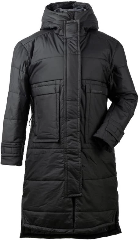 - Gepolsterter Parka mit zwei Fronttaschen, Einsatz- und Reißverschlusstaschen, umlaufendem Reißverschluss vorne, langen Neoprenmanschetten, fester Kapuze.