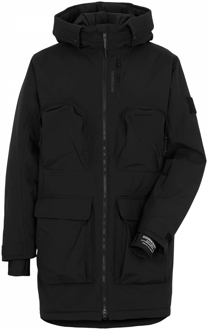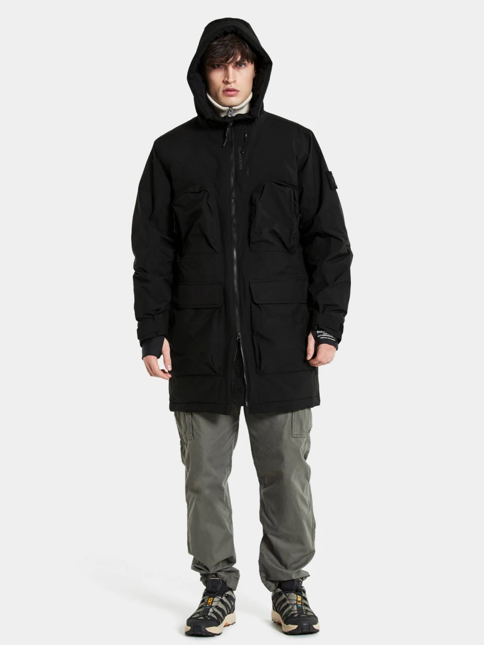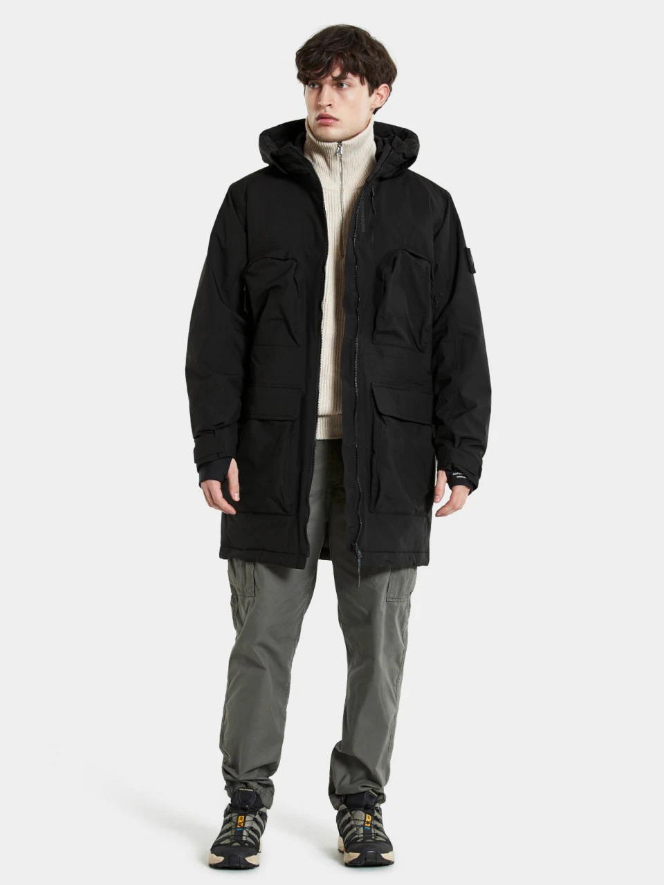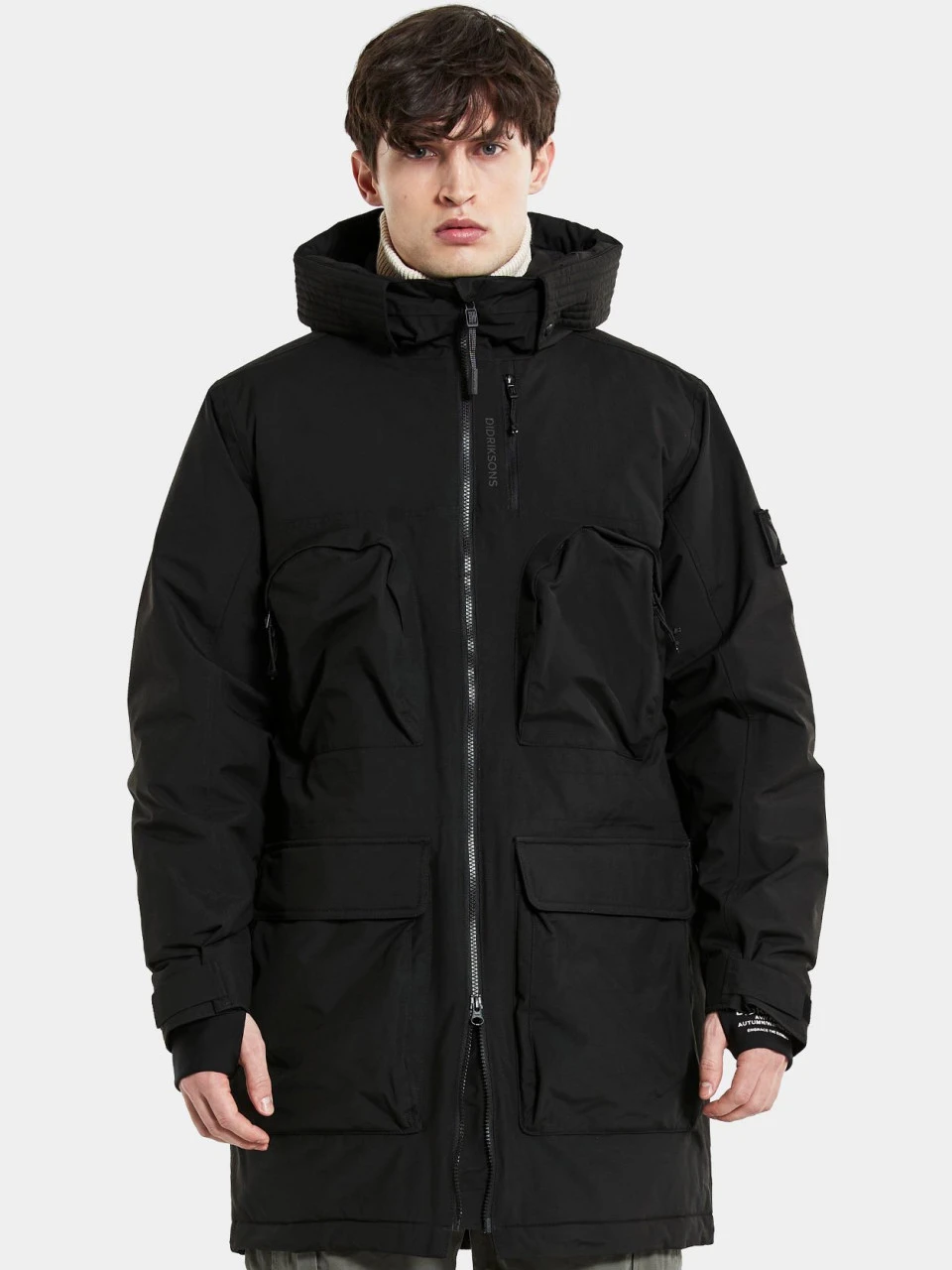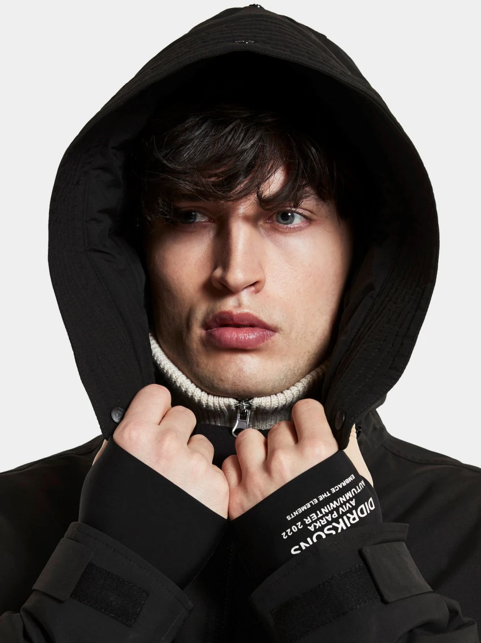 Der wind- und wasserdichte Parka Aviv von Didriksons hat eine leichte Wattierung, versiegelte Nähte und große Taschen. Dieser Winterparka zeigt Charakter. Aviv besticht durch das matte Finish und einen transparenten Print auf dem Rücken.