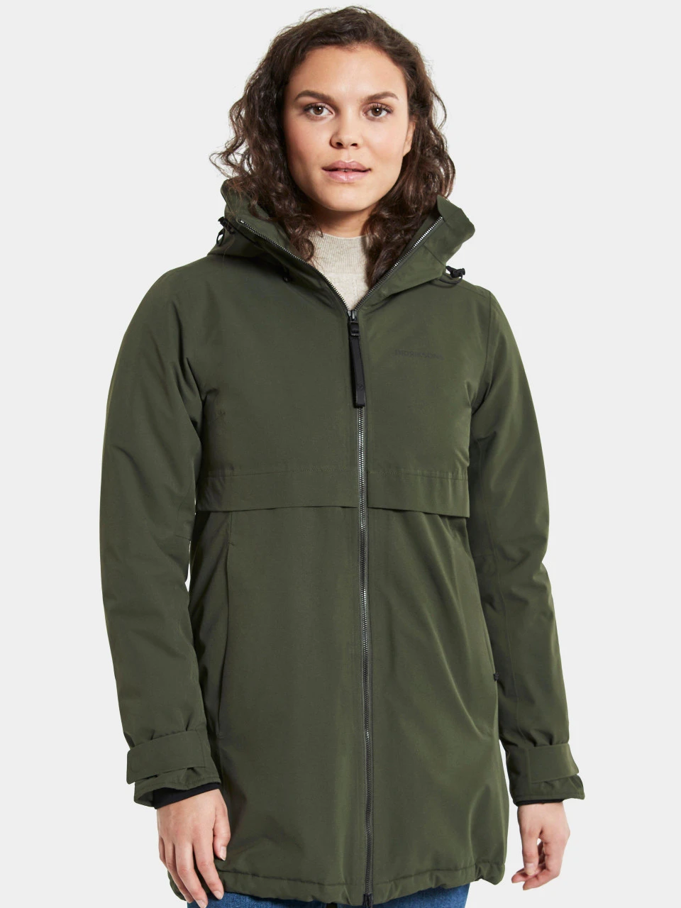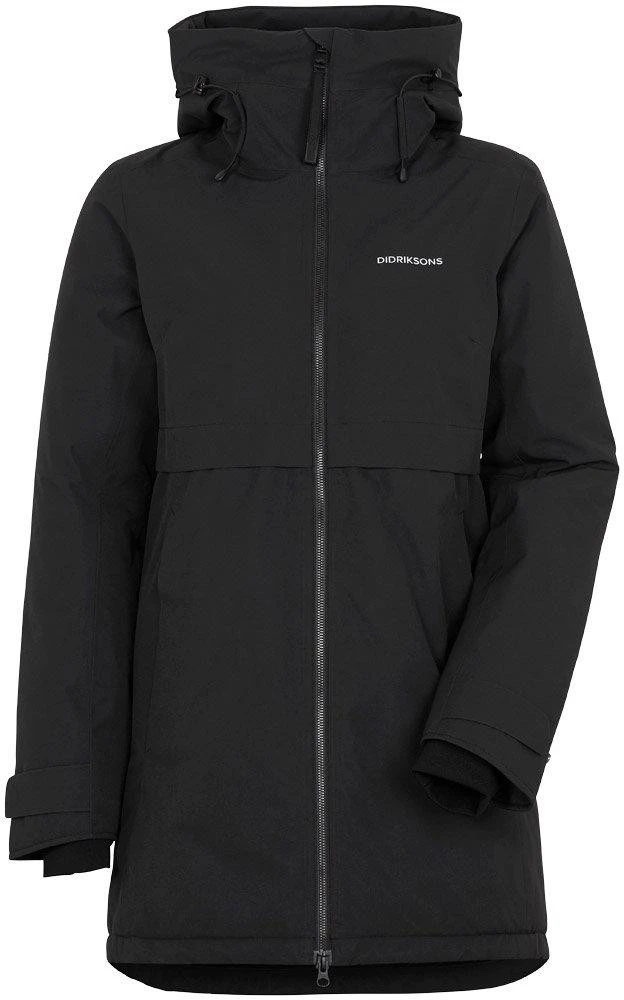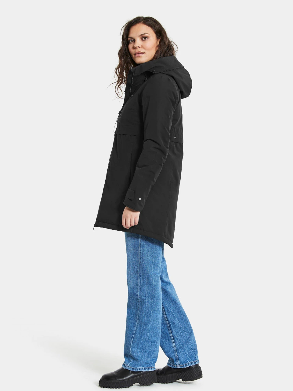 Der leicht wattierte Parka Helle von Didriksons besticht durch den weichen Griff und ist wie gemacht für den Alltag. Die normale Passform mit figurbetonter Silhouette verleiht dem Parka einen angenehm lässigen Look. Dank versiegelter Nähte ist das atmungsaktive Modell zu 100 % wind- und wasserdicht. Die angeschnittene Kapuze und der hohe Kragen schützen hervorragend vor kaltem Wind. Zwei Vordertaschen und zwei Innentaschen mit Reißverschluss sorgen für genügend Stauraum. Saum, Kapuze und Ärmelabschlüsse lassen sich verstellen. Die Isolierung aus 100 % Recyclingfasern und das pigmentgefärbtes Futter schont die Umwelt in der Produktion. Bei der Pigmentfärbung von Polyester- oder Polyamidstoffen werden bis zu 80 % weniger Wasser verbraucht als bei herkömmlichen Färbeverfahren. Bei den Farbstellungen Black, Dark Night Blue und Deep Green ist auch der Oberstoff pigmentgefärbt. Zusätzlich ist der Parka mit einer PFC-freien wasserabweisende Imprägnierung versehen.