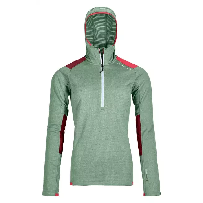 Auf langen Klettertouren bietet der Fleece Light Grid Zip Neck Hoody von Ortovox eine perfekte Kombination aus minimalem Gewicht, hoher Isolation, Abriebschutz und Ventilation. Diese Eigenschaften hat der Hoody der Materialkombination aus feiner tasmanischer Merinowolle mit Kanalstruktur innen und Polyester auf der Außenseite zu verdanken. Der ergonomisch bequeme Schnitt für Frauen lässt viel Bewegungsfreiheit beim Klettern zu, während verstärkte Einsätze im Schulter- und Ellbogenbereich zusätzlichen Schutz vor Abrieb geben. Die schützende Kapuze passt außerdem unter jeden Helm. Dank der tiefen Zipöffnung geht das An- und Ausziehen schnell und unproblematisch. Der Hoody ist ein rundum idealer Begleiter für Ihre nächste Klettertour.